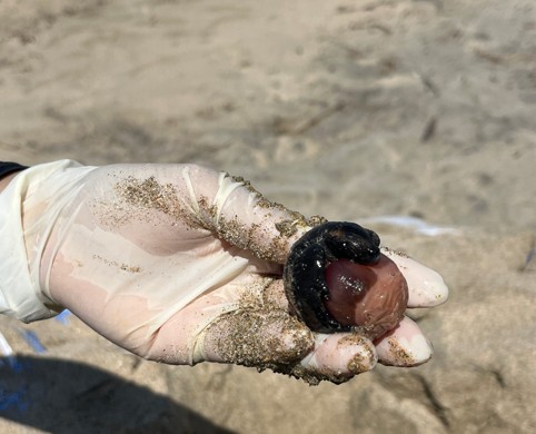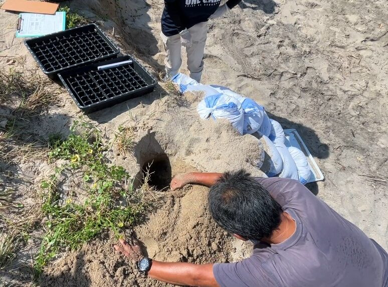 3ヵ所とも孵化・脱出終了後に鹿児島水族館の学芸員とNPOカメチドリで協働調査しました。今回初めて産卵から脱出までの巣の温度を測定したことにより、巣穴がオスとメスの生まれる確率が50:50になる理想的な平均温度(約29℃)であったことがわかりました。2か所は海水に浸かる場所に産卵したため、卵を移設しましたが、孵化率も70%以上で移設の方法も適切であったと思われます。