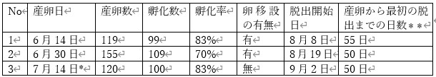 *3回目の産卵は見落としており、産卵周期から推定した産卵日。9/2早朝に子ガメ脱出の足跡があった